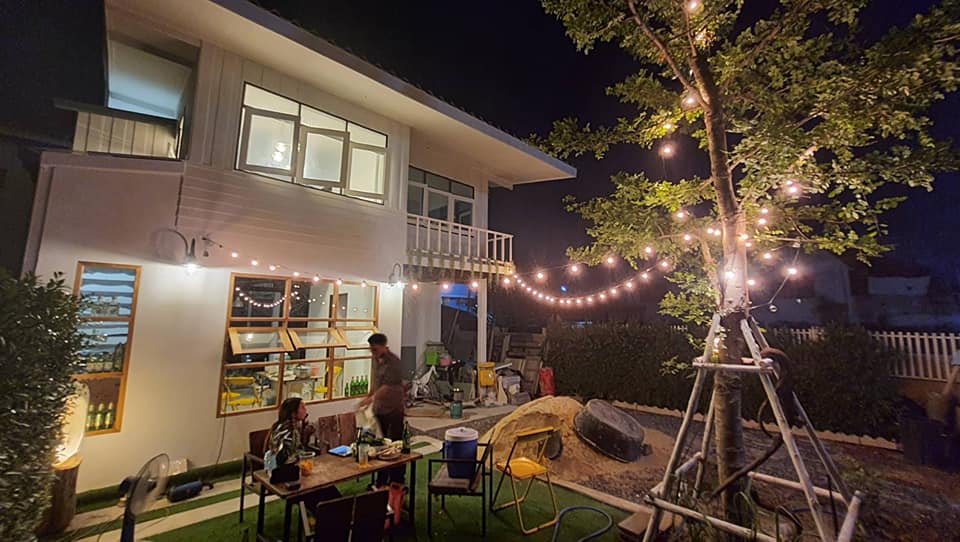 บรรยากาศภายนอกบ้านที่ตอนนี้มีลานกลางแจ้งเอาไว้ปาร์ตี้สังสรรค์ มีไฟสายที่ติดเอาไว้ทั่วบริเวณเพื่อให้แสงสว่างและสร้างบรรยากาศให้สวยงาม
