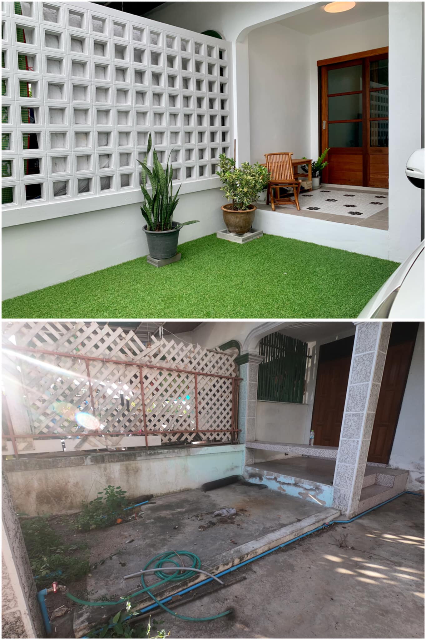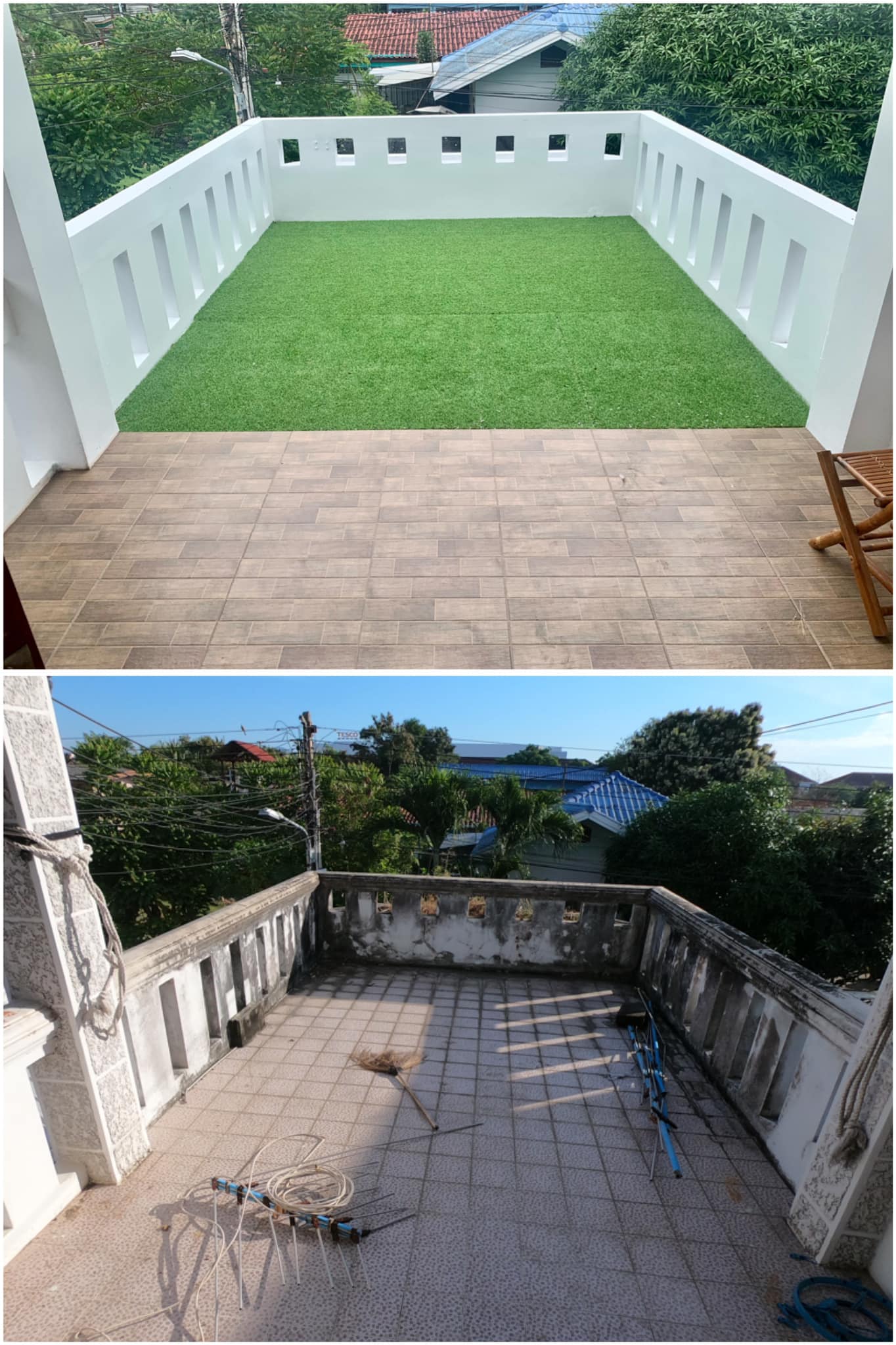 พื้นที่ระเบียงนอกบ้านปูพื้นด้วยหญ้าเทียม เตรียมไว้เป็นมุมนั่งชิลล์