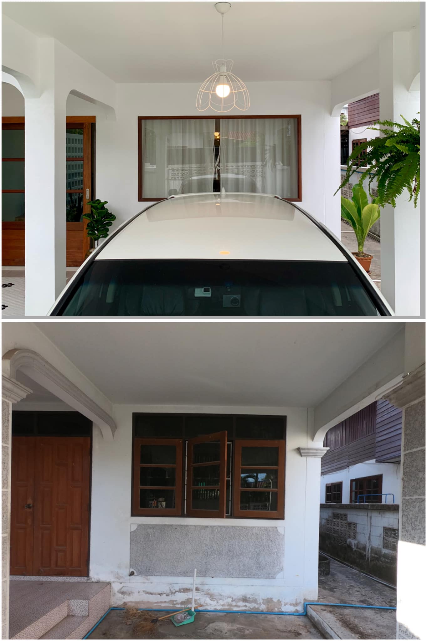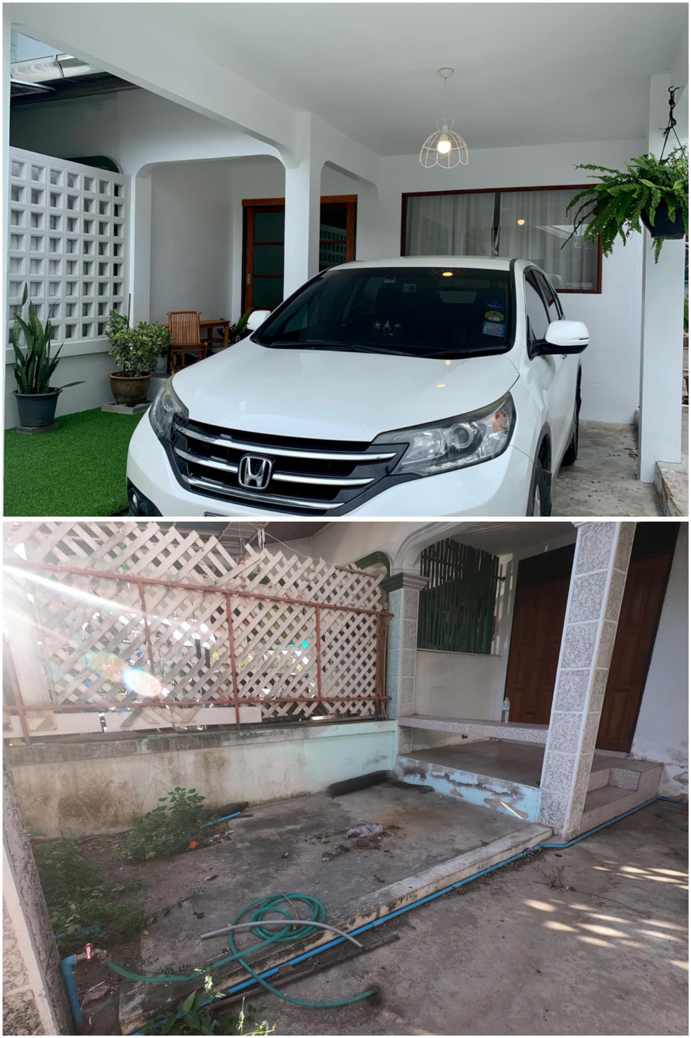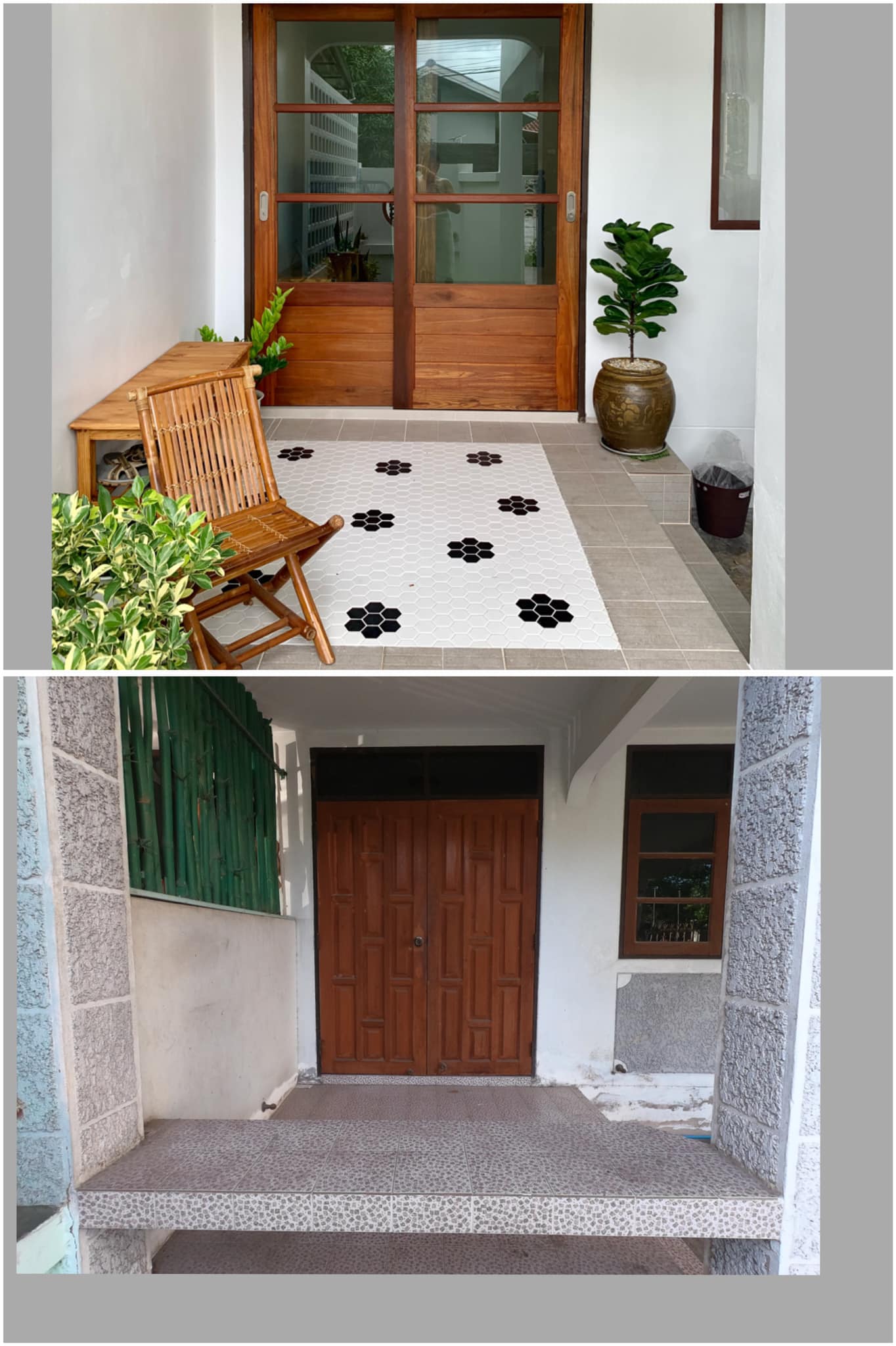 หน้าบ้านเปลี่ยนบานประตูเป็นบานเลื่อน แล้วปูด้วยกระเบื้องหกเหลี่ยม