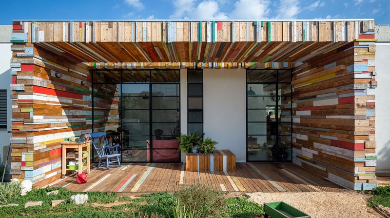 บ้านหลังนี้ก่มีทำเลที่ตั้งอยู่ Hofit ประเทศอิสราเอล ดีไซน์โดยรวมตกแต่งแบบสไตล์คอนเทมโพรารี ผนังด้านหน้าก่อสร้างจากเศษไม้รูปทรงสี่เหลี่ยมผืนผ้าขนาดเล็ก ตกแต่งด้วยโทนสีแดง เขียว ฟ้า และขาว ประกอบขึ้นจนกลายเป็นหลังคาปกคลุมบริเวณพื้นที่นั่งเล่นหน้าบ้าน
