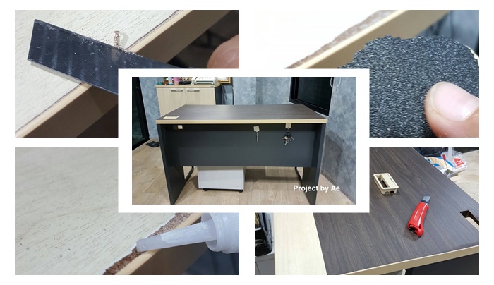 สำรวจโต๊ะว่ามีตรงไหนพองบ้าง แล้วเริ่มใช้คัตเตอร์แซะผิวด้านหน้าออก โดยขนานใบมีดกับหน้าโต๊ะให้ได้มากที่สุด