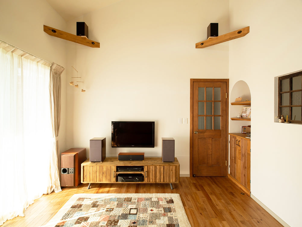 ในด้านของวัสดุ วัสดุหลัก ๆ ก็จะเป็นงานไม้ ซึ่งจะให้ความเป็นธรรมชาติ อย่างห้องนั่งเล่นห้องนี้ที่องค์ประกอบงานไม้ช่วยสร้างบรรยากาศที่ผ่อนคลายให้ห้องได้ไม่น้อยเลย