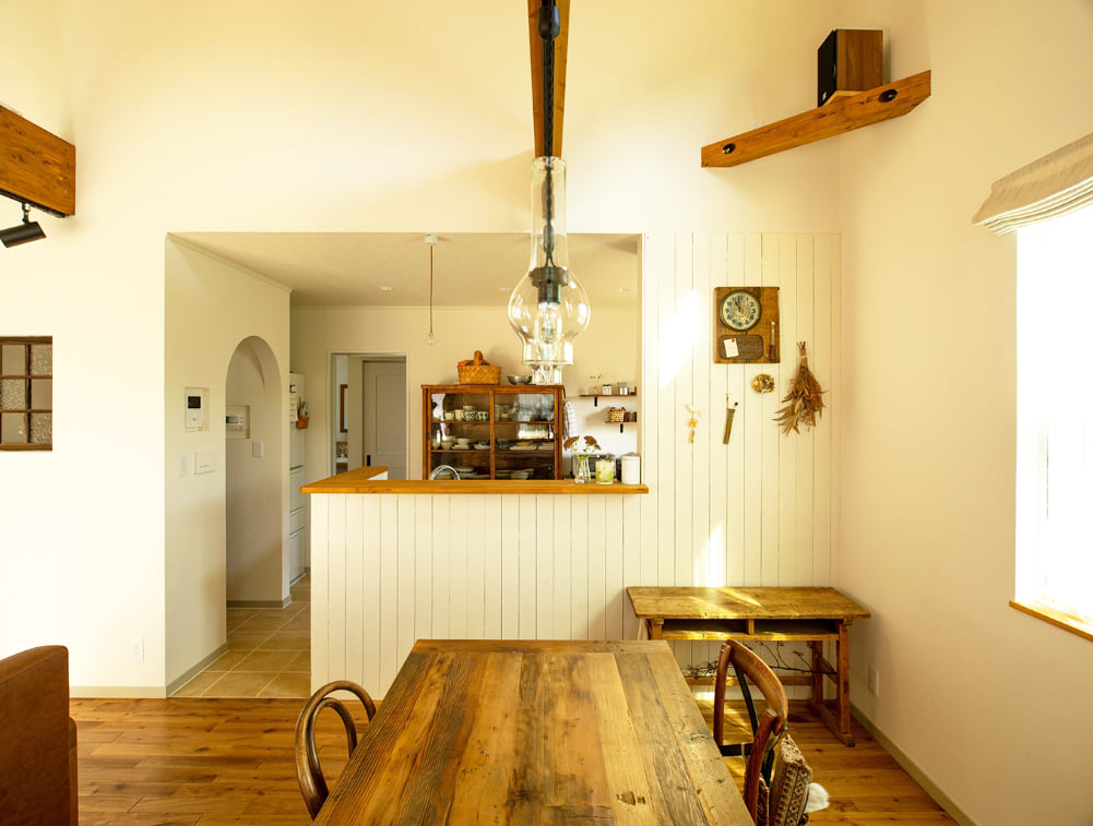 มุมนี้จะเป็นพื้นที่ห้องรับประทานอาหารที่มีโต๊ะไม้ขนาดใหญ่ที่โดดเด่นจัดเอาไว้ ใกล้ ๆ กันนั้นเป็นห้องครัวขนาดเล็กที่เพียงพอสำหรับการปรุงอาหารมื้อเล็ก ๆ แล้ว