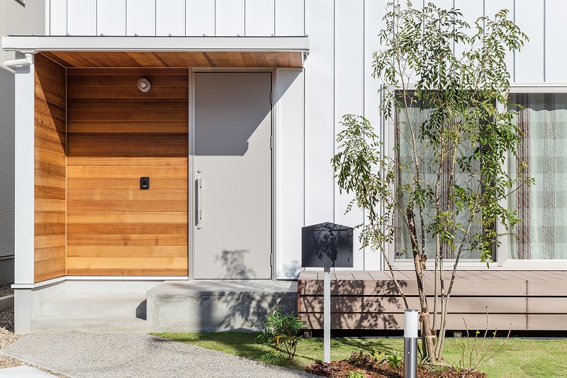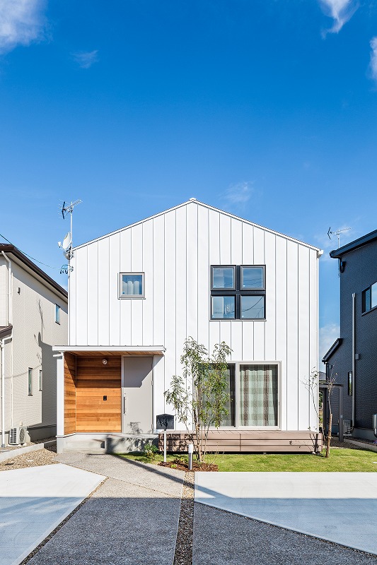 ที่หน้าบ้านจะมีความเรียบง่าย มีเฉลียงยกพื้นสูงเล็ก ๆ เอาไว้ให้นั่งเล่น ที่ด้านนอกมีสนามหญ้าพร้อมกับการจัดสวนเล็ก ๆ เพื่อเพิ่มสีเขียวให้กับบ้าน
