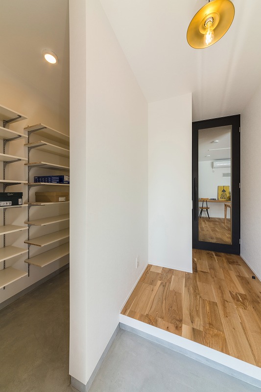ตามสไตล์บ้านญี่ปุ่น เมื่อก้าวเข้ามาภายในบ้าน ก็จะพบโถงเล็ก ๆ สำหรับถอดเก็บรองเท้า ซึ่งบ้านหลังนี้ได้เพิ่มพื้นที่เก็บของและชั้นเล็ก ๆ เอาไว้ด้วย