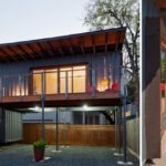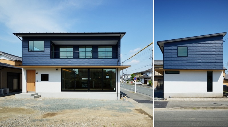 Toyokawa City Shimibe บ้านสองชั้นที่ได้รับการออกแบบมาเพื่อตอบรับกับสภาพภูมิประเทศของญี่ปุ่น ที่มักจะเกิดแผ่นดินไหวอยู่บ่อยครั้ง โครงสร้างบ้านปูนไม่สูงมากนัก เน้นการตกแต่งด้วยโทนสีเรียบง่าย ผสมผสานเข้ากับผนังไม้สีน้ำเงินเข้ม ปหคลุมด้วยหลังคามุงเมทัลชีททรงเพิงหมาแหงน