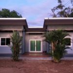 ตัวบ้านยกพื้นต่ำ เพื่อป้องกันเศษฝุ่นหรือินที่อาจจะกระเด็นเข้าไปภายในบ้านได้ ผนังบริเวณหน้าบ้านติดตั้งหน้าต่างกระจกใสบายใหญ่ ส่วนชั้นบนกรุช่องหน้าต่างไว้โดยรอบ เพื่อให้แสงสว่างส่องผ่านเข้าไปด้านในได้อย่างทั่วถึง อีกทั้งยังเปิดให้เห็นทิวทัศน์ภายนอกได้อย่างถนัดตา