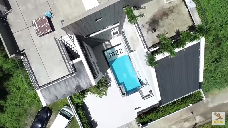 บ้านหลังนี้สร้างขึ้นจากน้ำพักน้ำแรงของหนุ่มแจ๊สและสาวแจงทั้งหมด เป็นบ้านสไตล์โมเดิร์นหลังใหญ่ขนาดสามชั้น พร้อมด้วยชั้นดาดฟ้า มีดีไซน์ที่โดดเด่น ทันสมัย ตกแต่งในโทนสีเทาสุดเท่ ผสานไปกับโทนสีเขียวของต้นไม้น้อยใหญ่ที่ถูกจัดไว้ตามจุดต่าง ๆ รอบอาคาร