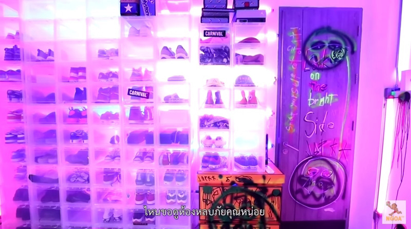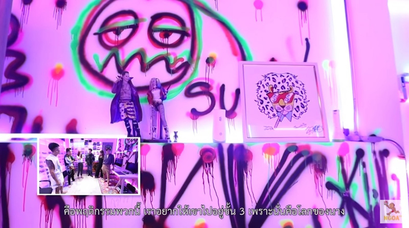 ในห้องนี้มีการตกแต่งที่จัดจ้าน เน้นโทนสีฉูดฉาด ผนังเต็มไปด้วยสเปรย์สี ให้ฟีลเหมือนกับอยู่ในผับ ซึ่งก็สะท้อนตัวตนสุดเฟี้ยวฟ้าวของหนุ่มแจ๊สได้อย่างชัดเจน