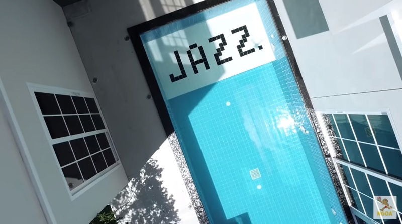 จุดเด่นที่สังเกตได้ชัดเจนเลยก็คือ สระว่ายน้ำตรงกลางสุดเท่ที่ชื่อหนุ่มแจ๊สเป็นอักษรภาษาอังกฤษเขียนว่า Jazz อยู่ตรงพื้นสระ ซึ่งก็เป็นมุมสุดโปรดของหนุ่มแจ๊สนั่นเองครับ