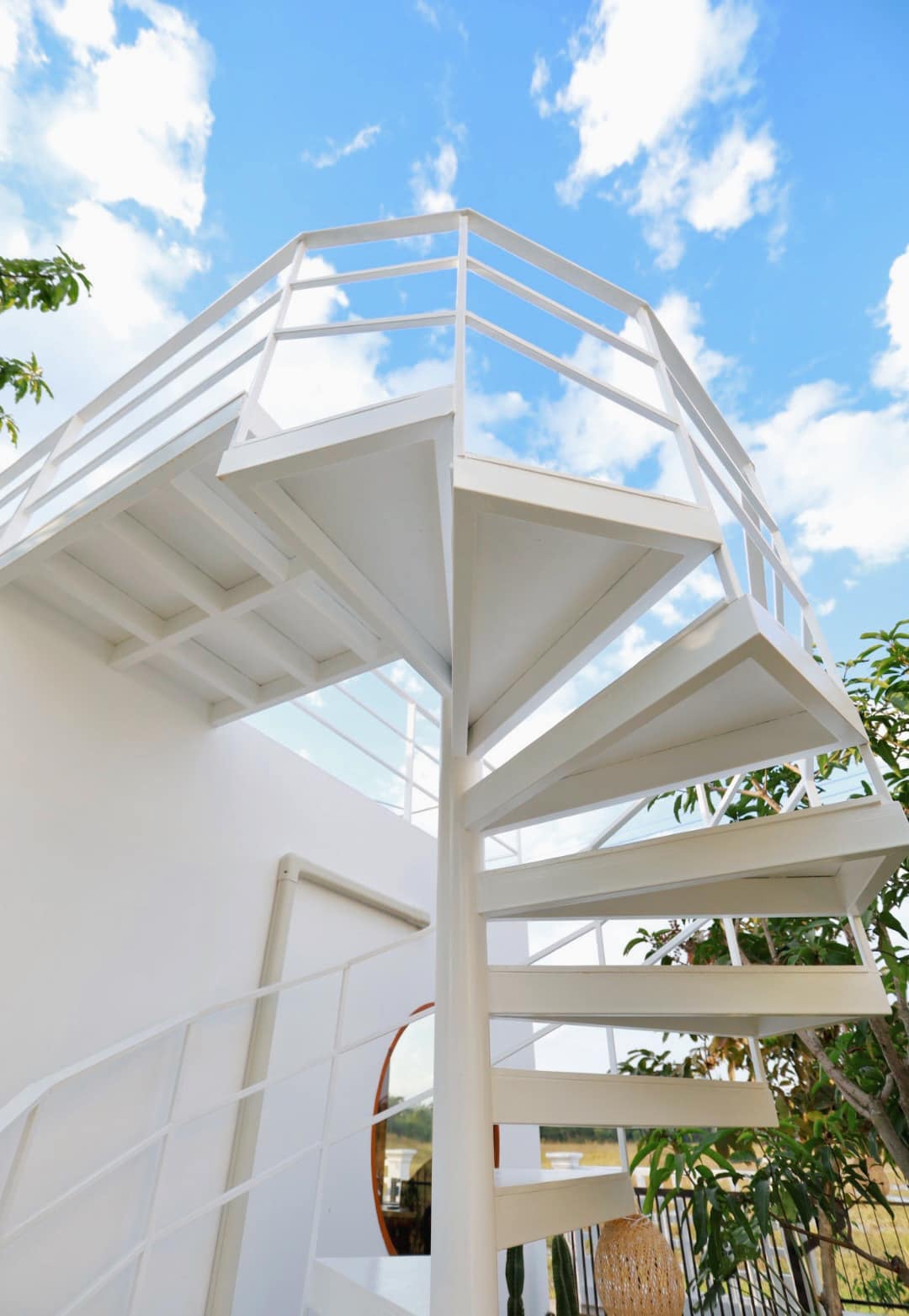 อีกจุดหนึ่งที่เป็นความโดดเด่นของร้าน นั่นคือส่วนของดาดฟ้า โดยลูกค้าสามารถไปยังดาดฟ้าผ่านทางบันไดวนสีขาวตรงนี้ได้เลย