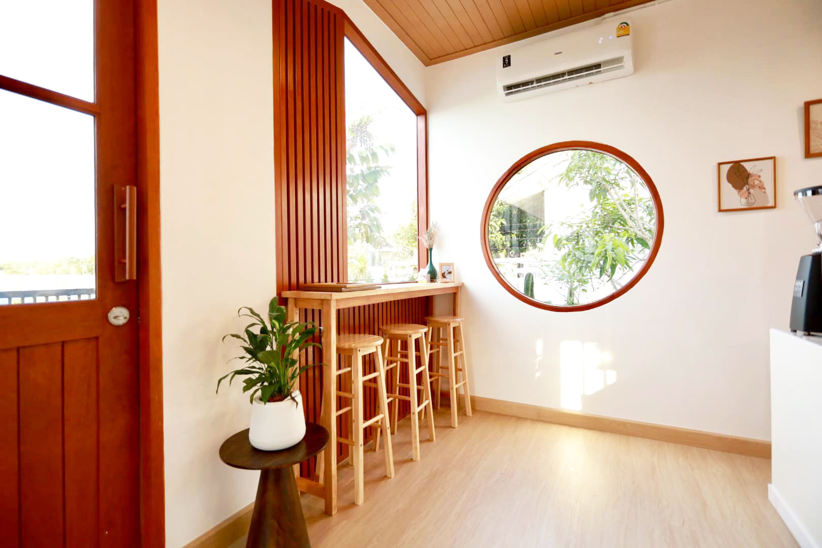 คาเฟ่ร้านนี้ มีการออกแบบอาคารที่ผสมผสานความมินิมอลผ่านองค์ประกอบการตกแต่งที่เรียบง่าย มีโทนสีครีมและน้ำตาลเป็นโทนสีหลักของร้าน ตัวหลังคาทรงแหลมแบบเอ-เฟรม ยังช่วยสะท้อนกลิ่นอายความเป็นบ้านนอร์ดิกได้เป็นอย่างดีอีกด้วย