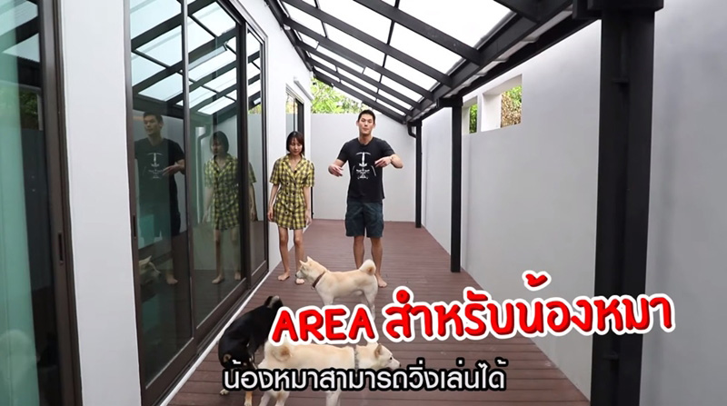 และสุดท้ายนี้ จะเป็นพื้นที่เอาท์ดอร์รอบบ้าน ออกแบบเพื่อให้น้องหมาได้วิ่งเล่นอย่างเต็มที่ โดยหนุ่มกันต์และสาวพลอยก็ได้กั้นรั้วเพื่อความปลอดภัยของน้องหมาอีกด้วย