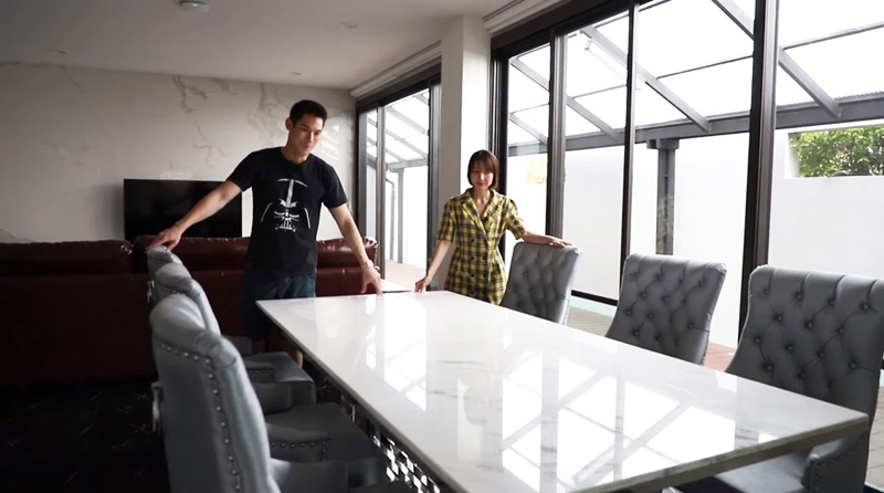 โต๊ะทานข้าวในห้องโถงนี้มีขนาดใหญ่มาก รองรับได้ถึง 6 คน ซึ่งเป็นเฟอร์นิเจอร์ที่สั่งทำพิเศษจากหินแผ่นเดียว