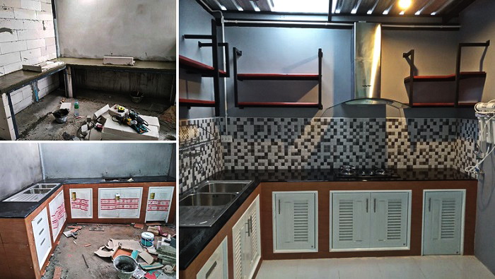 รีวิว ต่อเติมห้องครัวหลังบ้านทาวน์โฮม พร้อมเคาน์เตอร์ตัว L และชั้นวางของติดผนัง
