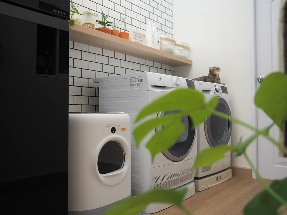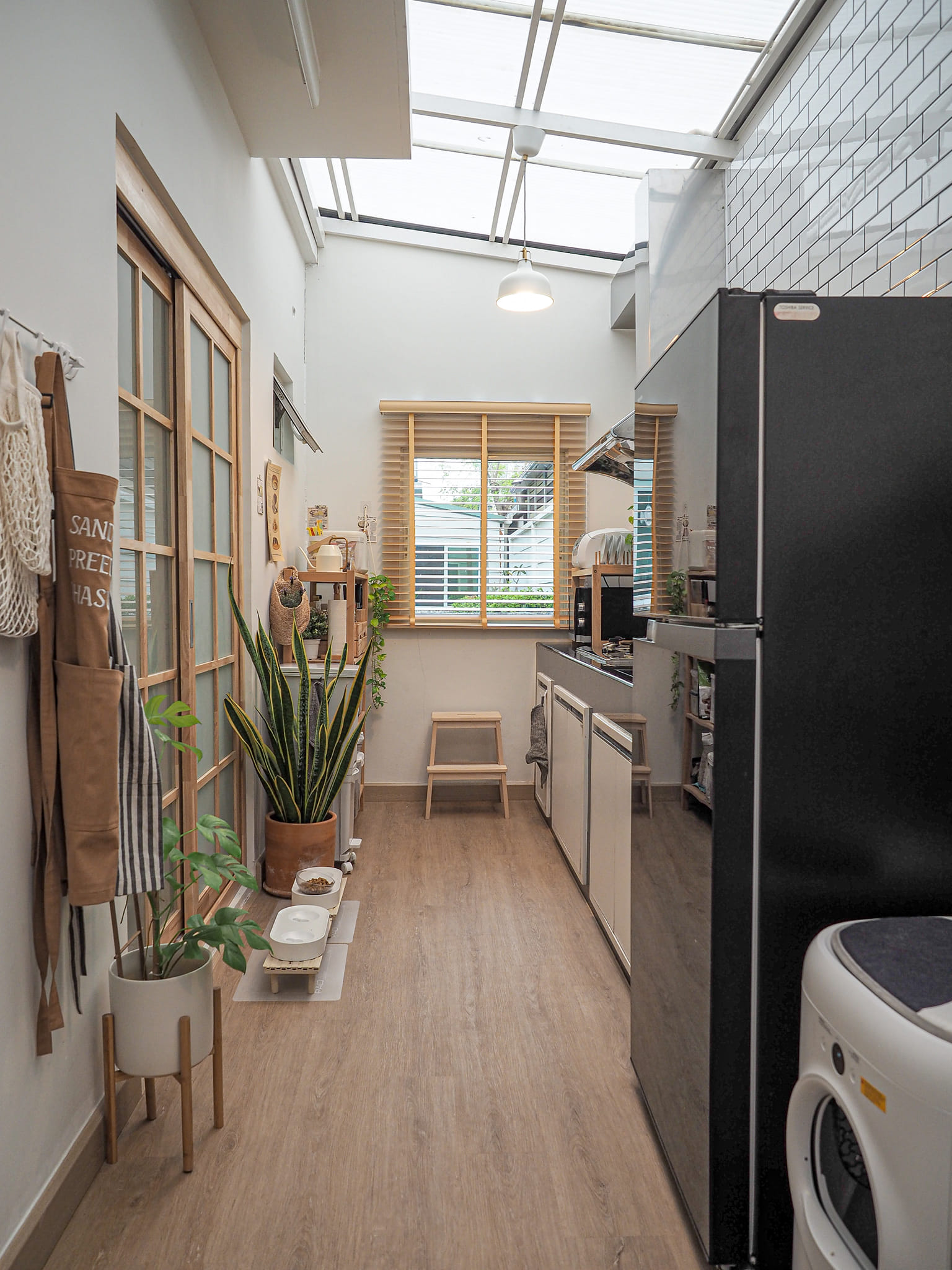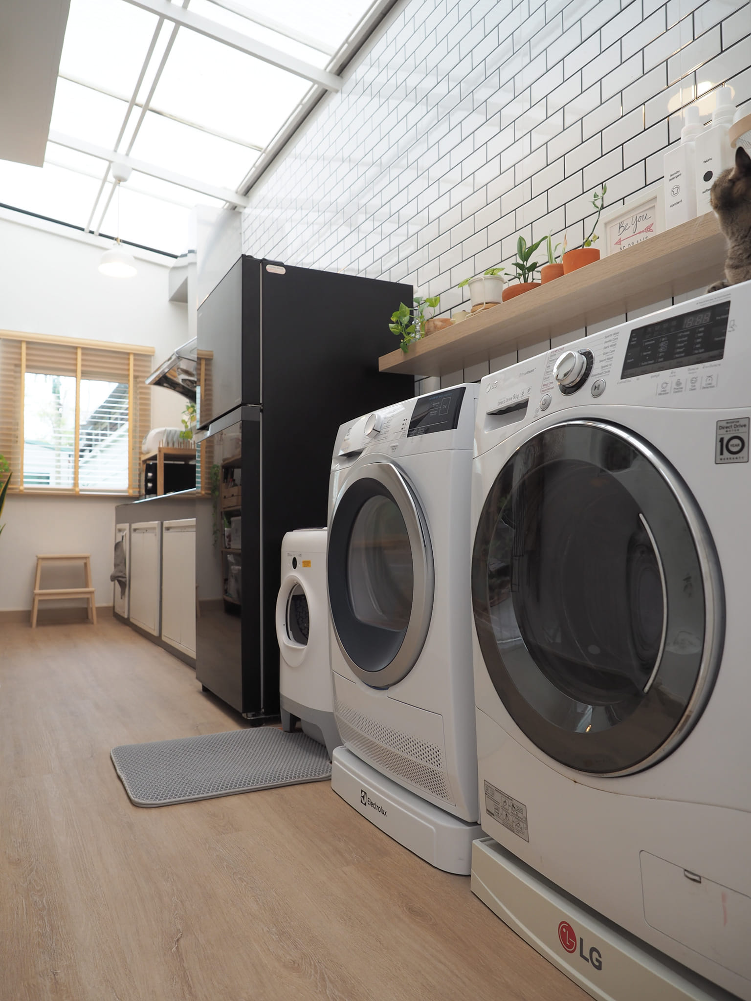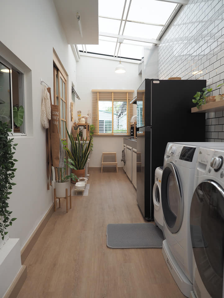 ภายในห้องครัวแห่งนี้ยังรวมเอาพื้นที่ซักล้างเอาไว้ด้วย เนื่องจากพื้นที่มีขนาดที่ยาว จึงสามารถจัดมุมเพื่อวางเครื่องซักผ้าได้อย่างพอเหมาะ