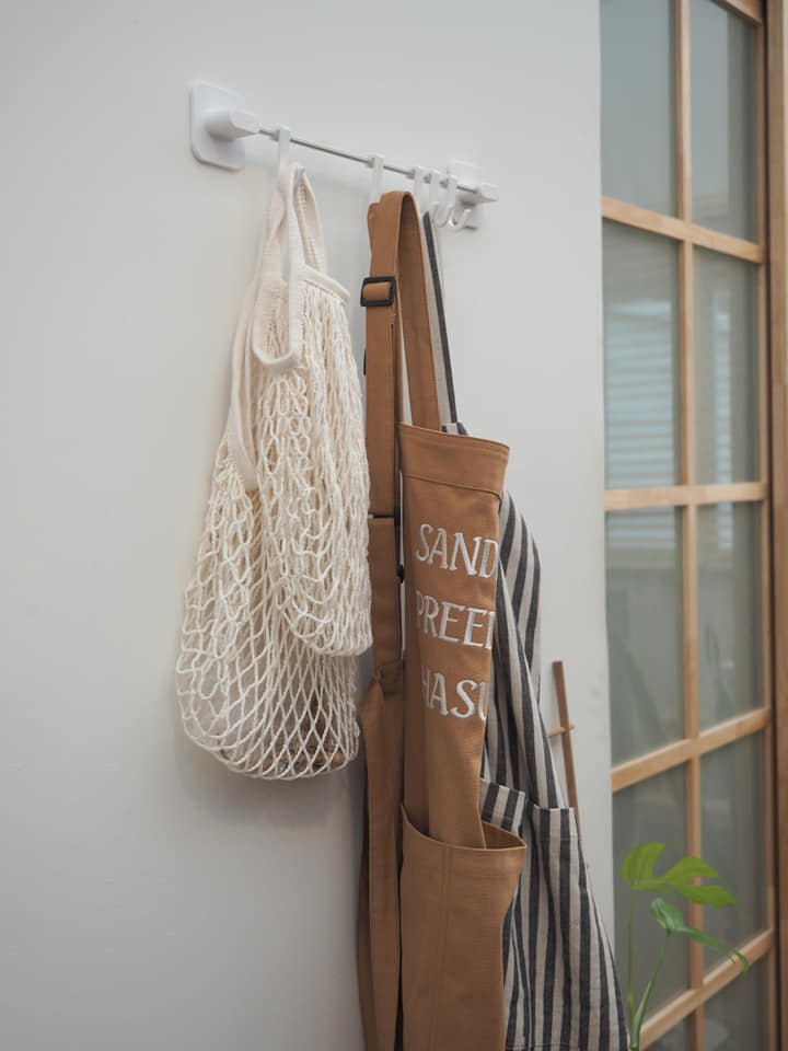 ผนังด้านนี้จะมีที่แขวนผ้ากันเปื้อนสำหรับทำอาหารเอาไว้อีกด้วย ประตูห้องครัวเป็นแบบบานเลื่อนที่ดูเข้ากับธีมมินิมอลเหมือนกัน