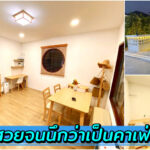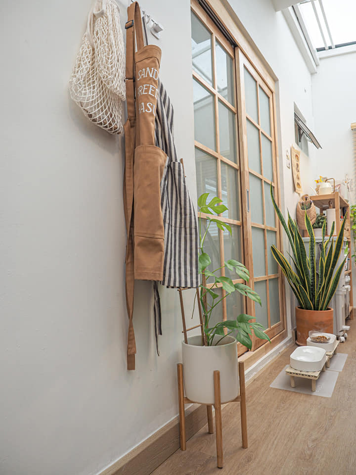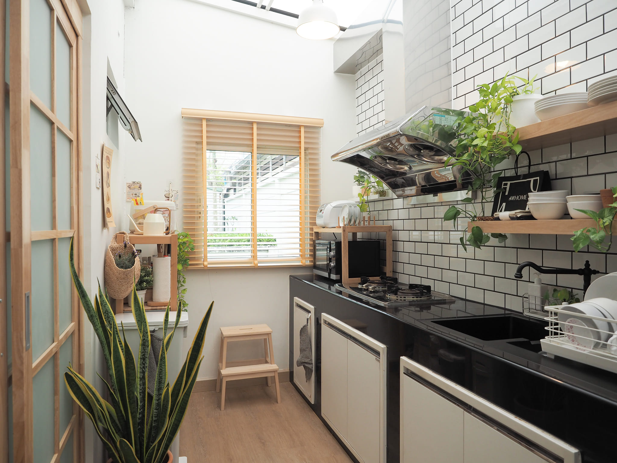 นอกจากเฟอร์นิเจอร์ต่าง ๆ แล้ว เจ้าของบ้านยังตกแต่งภายในห้องครัวด้วยต้นไม้เล็ก ๆ จึงทำให้ครัวมีบรรยากาศที่อ่อนโยนและสดชื่นเพิ่มมากขึ้น