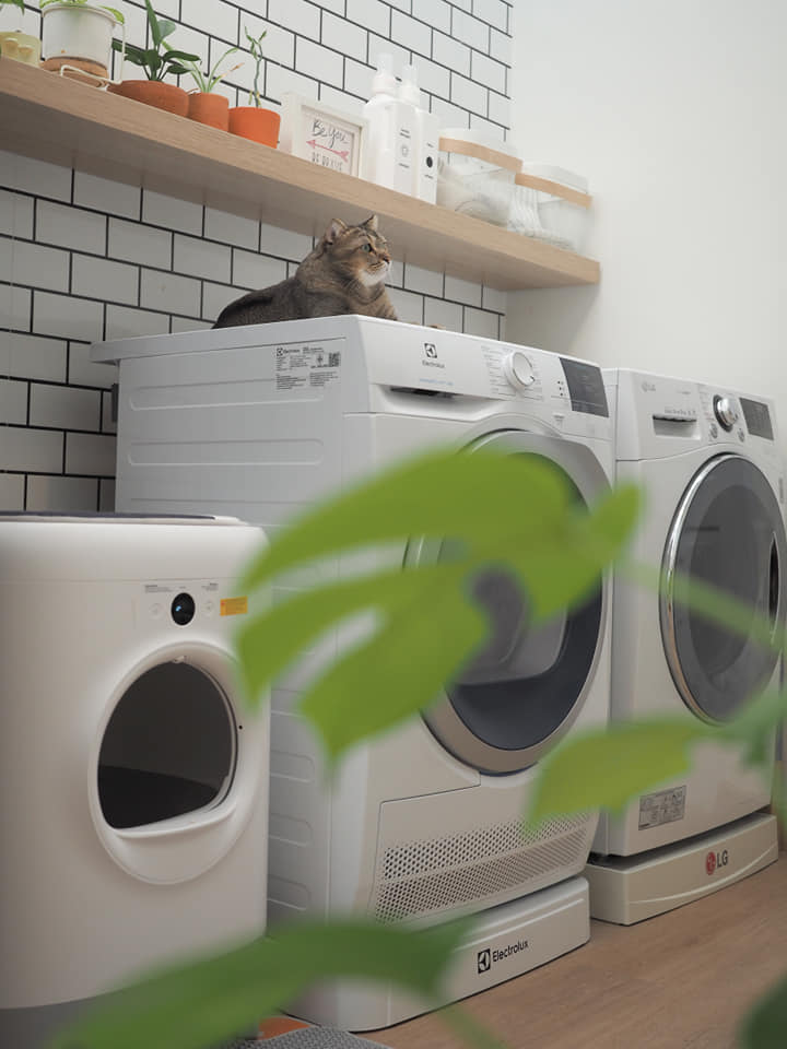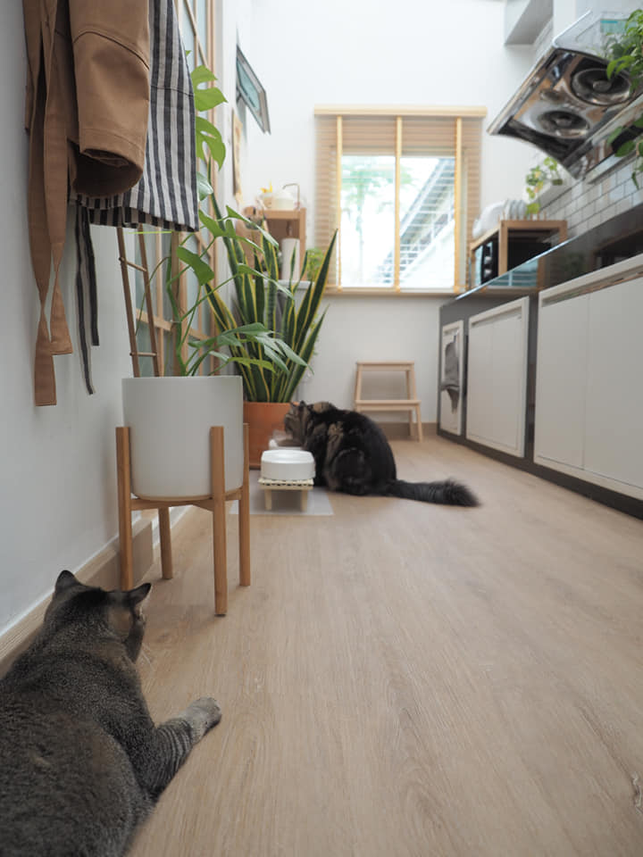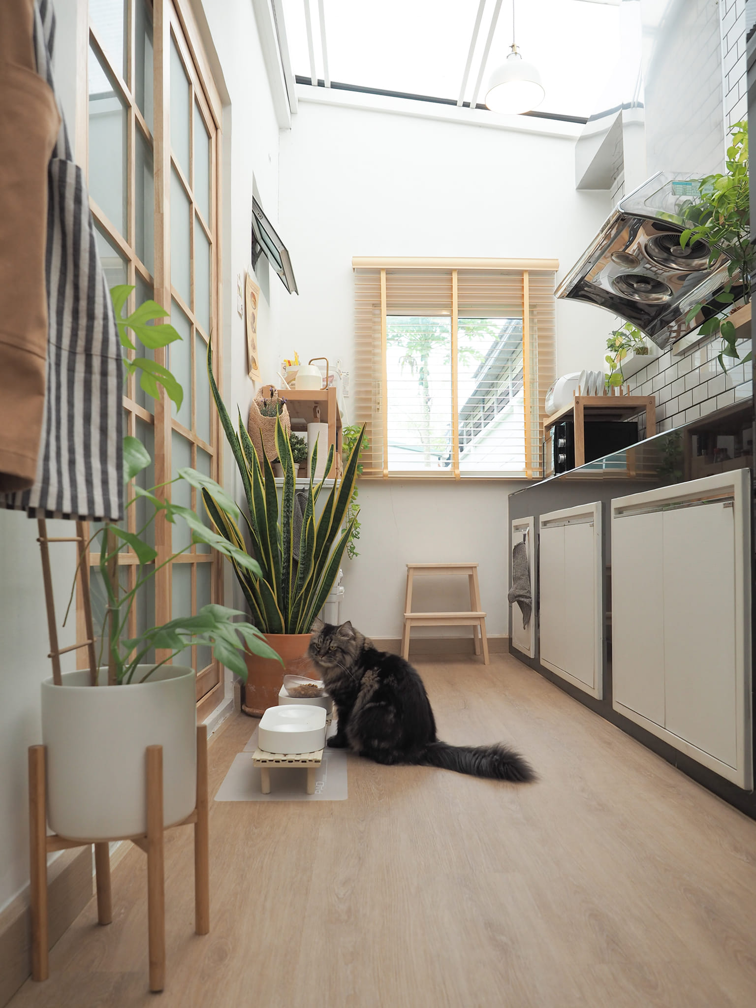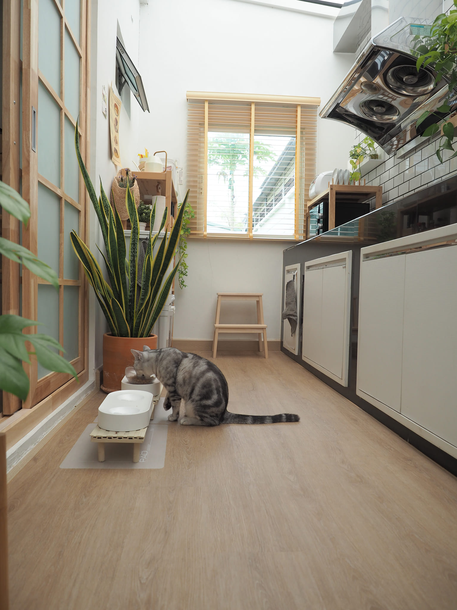 การันตีความอยู่สบายใช้งานง่ายโดยน้องแมวตัวนี้ ที่มีทั้งชามข้าวแมว และที่อึแมวอย่างครบถ้วนภายในห้องครัวแห่งนี้