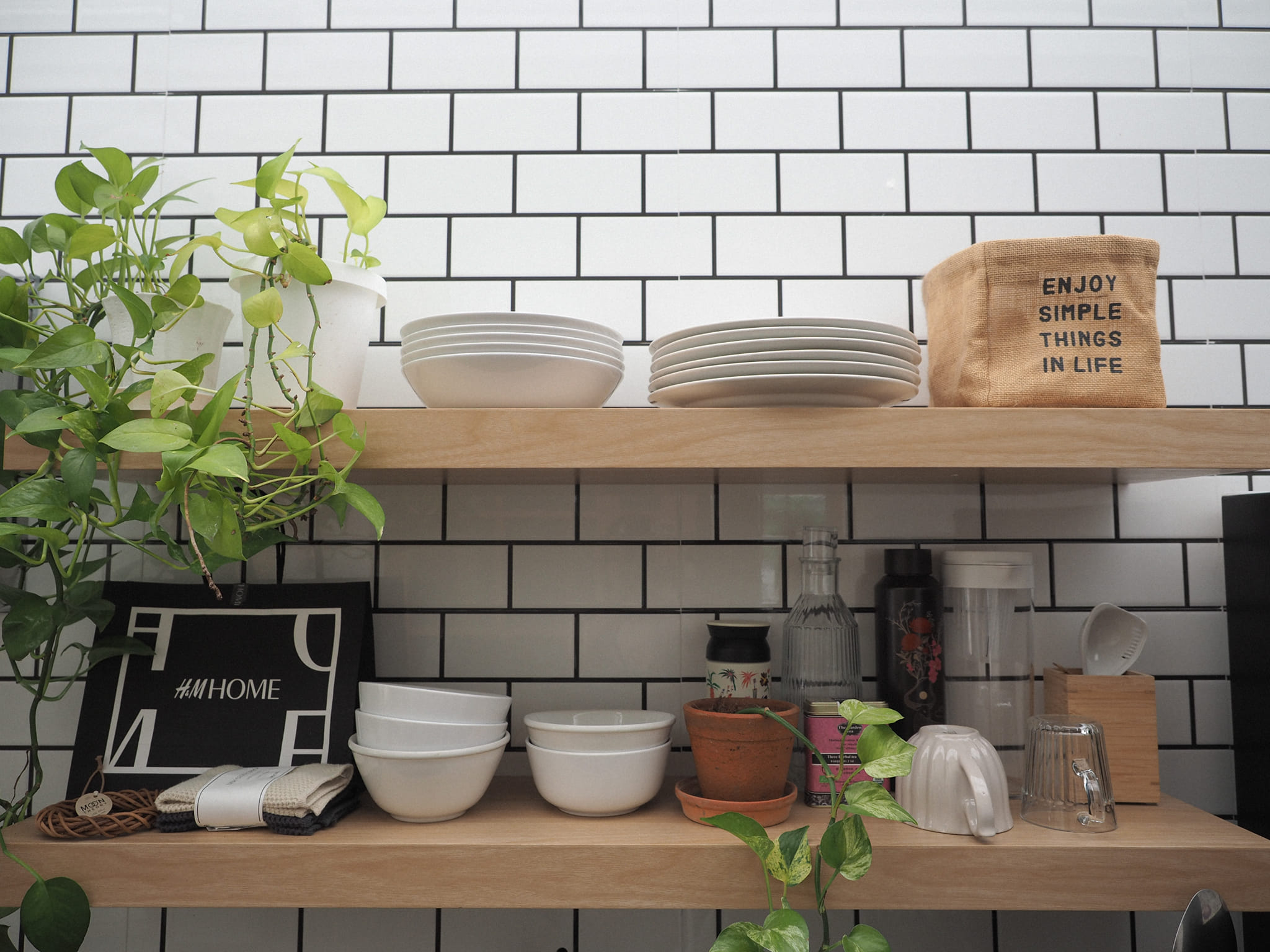 ชั้นไม้แบบติดตั้งเองที่มีประโยชน์มาก สามารถจัดวางจานชามและแก้วน้ำสำหรับพร้อมใช้งานได้อย่างสะดวก แถมดีไซน์ยังสวยด้วย