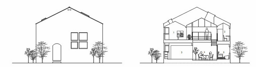 บ้านหลังนี้มีดีไซน์ทรงจั่ว เพดานสูง ตกแต่งด้วยเฟอร์นิเจอร์น้อยชิ้น เน้นความโปร่งโล่งอยู่สบาย เปิดรับแสงแดดจากภายนอกผ่านช่องกระจกด้านบน ทำมุมมองภายในดูกว้างขึ้น