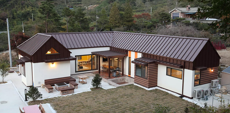 บ้านหลังนี้ก่อสร้างอยู่ที่ Gwangyang, Jeonnam ประเทศเกาหลีใต้ ลักษณะภายนอกคล้ายกับบ้านเกาหลีแบบดั้งเดิม ตกแต่งผนังด้วยโทนสีขาว ตัดกับหลังคาสีน้ำตาลเข้มดีไซน์คลาสสิค ตัวบ้านตัวแอลโอบล้อมสนามหญ้าที่อยู่ใจกลางบ้าน ซึ่งไม่ว่าจะอยู่ส่วนไหนของบ้านก็สามารถมองเห็นทิวทัศน์ธรรมชาติได้อย่างทั่วถึง