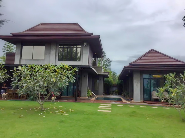 ผนังภายนอกตกแต่งด้วยปูนเปลือยโทนสีเทา หลังคาทรงปั้นหยามีเอกลักษณ์ ให้กลิ่นอายบ้านไทย มาพร้อมสนามหญ้ากว้างขวาง