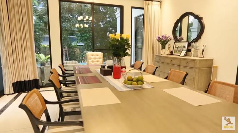 ห้องทานอาหารตกแต่งด้วยโทนสีธรรมชาติอย่างสีครีมและสีน้ำตาล โดดเด่นด้วยเก้าอี้ ของใช้ และของตกแต่งต่าง ๆ ที่มีสไตล์ชัดเจน