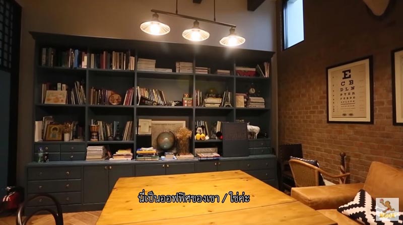 นอกจากนี้ ภายในบ้านยังมีโฮมออฟฟิศที่ตกแต่างในสไตล์อินดัสเทรียลลอฟท์ เน้นงานผนังอิฐเปลือย โคมไฟดีไซน์เท่ ๆ ดิบ ๆ ซึ่งเป็นห้องทำงานสำหรับพี่ชายคนโตนั่นเองครับ