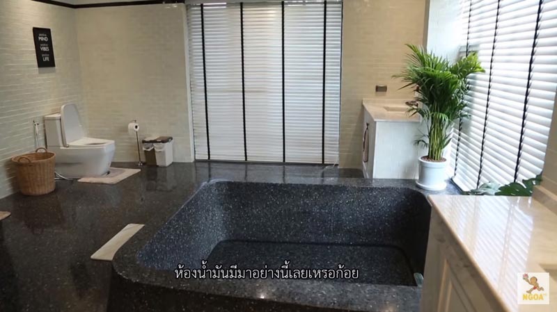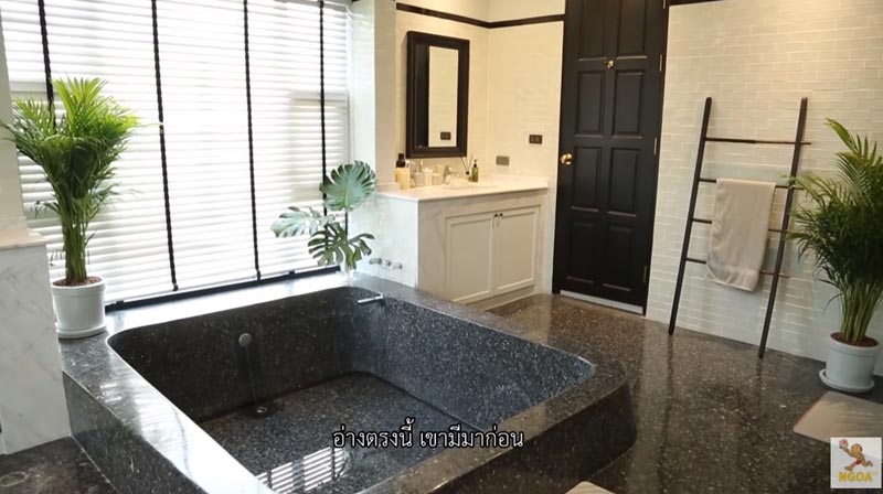 ที่น่าสนใจที่สุดก็คือห้องน้ำของสาวก้อย เพราะมีขนาดกว้างมาก ติดตั้งอ่างหินขัดสีดำทรงสี่เหลี่ยมไว้ตรงกลาง