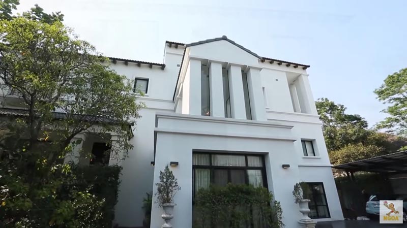 ตัวบ้านโทนสีขาวสะอาดตา มีลักษณะเหมือนคฤหาสน์ หลังคาโทนสีเทาอ่อน ตัดกับขอบกระจกสีดำ ดูหรูหรามีระดับ บริเวณรอบบ้านรายล้อมไปด้วยต้นไม้ต้นใหญ่มากมาย