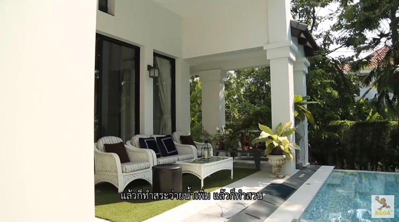 นอกจากนี้ ยังมีสระว่ายน้ำข้างบ้านทรงสี่เหลี่ยมพร้อมลานนั่งเล่นริมน้ำ รวมไปถึงมีลานปลูกผักให้คุณพ่อได้ใช้เวลาทดลองเกี่ยวกับต้นไม้ด้วย