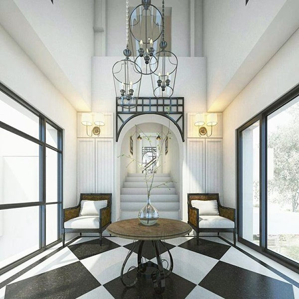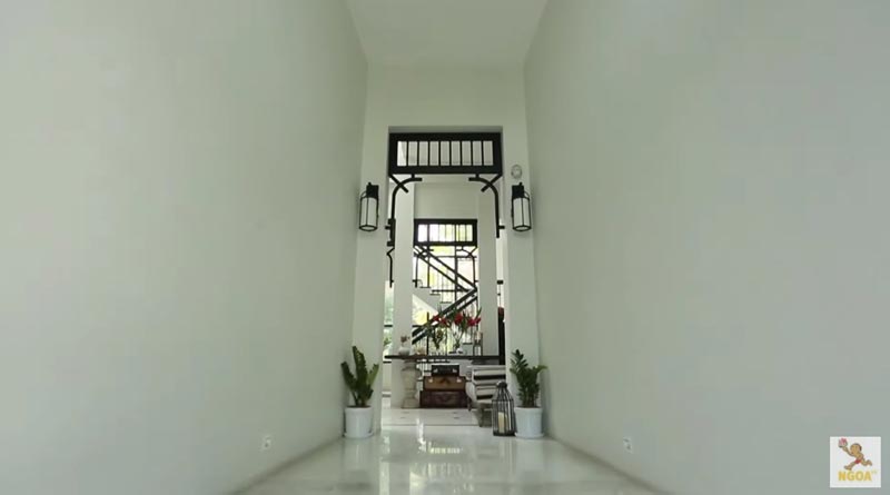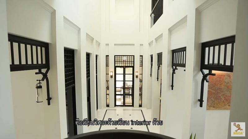 พี่ชายคนโตของสาวก้อยเป็นคนออกแบบทั้งภายในและภายนอก ส่วนสาวก้อยนั้นมีส่วนร่วมในเรื่องของการจัดและตกแต่งจุดต่าง ๆ ของบ้าน โดยบริเวณโถงนี้ยังคงเลือกใช้โทนสีขาวดำเป็นหลัก และติดช่องแสงบนหลังคาทำให้ดูไม่อึดอัดคับแคบ