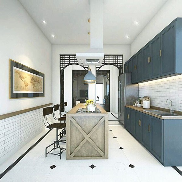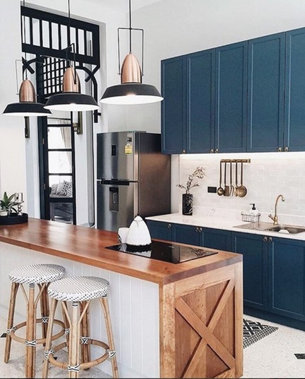 ส่วนนี้คือห้องครัว ตกแต่งด้วยเคาน์เตอร์ครัวและชั้นวางแขวนผนังโทนสีน้ำเงินอมเขียว