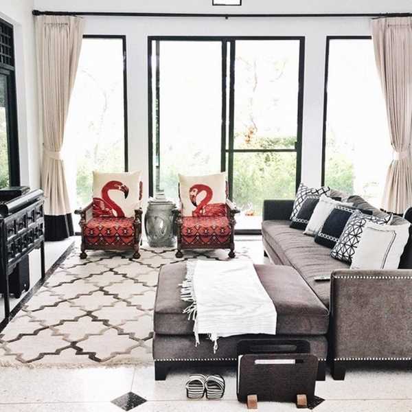สำหรับห้องนั่งเล่นนั้นจะเน้นเฟอร์นิเจอร์โทนสีทึบอย่างเทาเข้ม แดงเข้ม ตัดกับผ้าม่านและพรมสีอ่อน