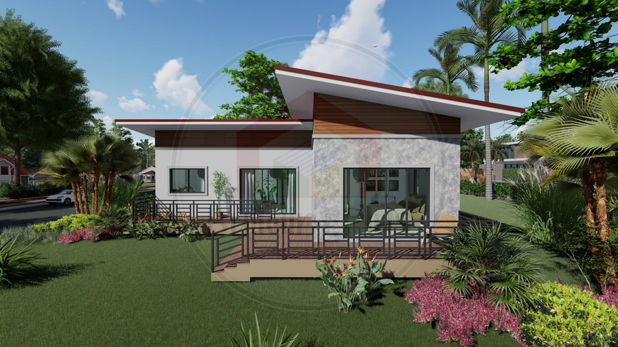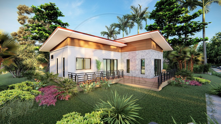 แบบบ้านหลังนี้เป็นเป้นบ้านชั้นเดียวสไตล์โมเดิร์นที่ถูกออกแบบในรูปทรงแบบตัวแอล (L-Shape House) จึงมีรูปลักษณ์ที่สวยงาม รายละเอียดการตกแต่งนั้น ผนังภายนอกตกแต่งด้วยผนังแบบปูนเปลือย บริเวณคานเลือกใช้สีน้ำตาล งานหลังคาจะเป็นแบบทรงเพิงหมาแหงนที่เข้ากันดีกับทรงสี่เหลี่ยมของบ้าน