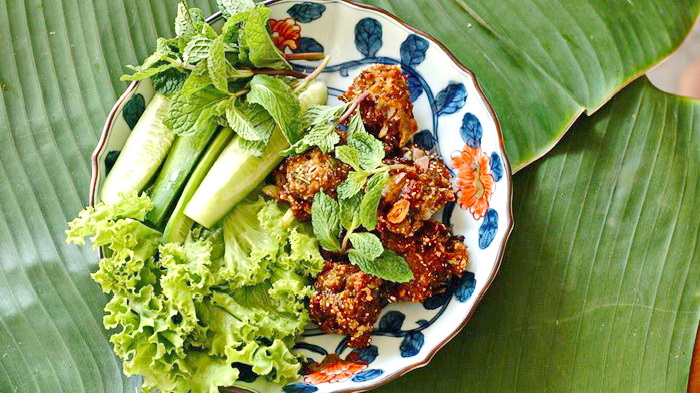 5. ตักออกมาพักในตะแกรงให้น้ำมันออกให้หมด เสริฟลาบทอดร้อนๆ พร้อมกับผักสดเย็นๆ