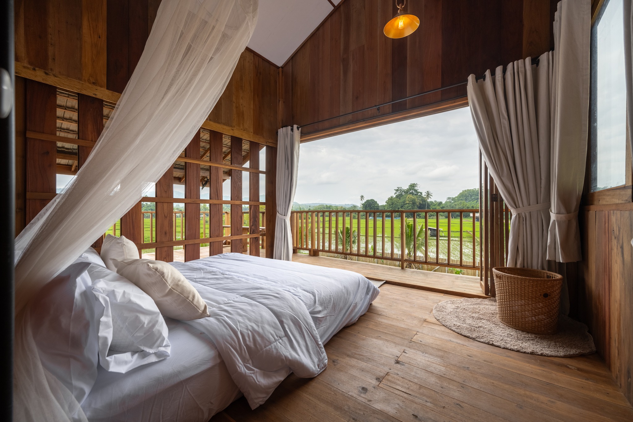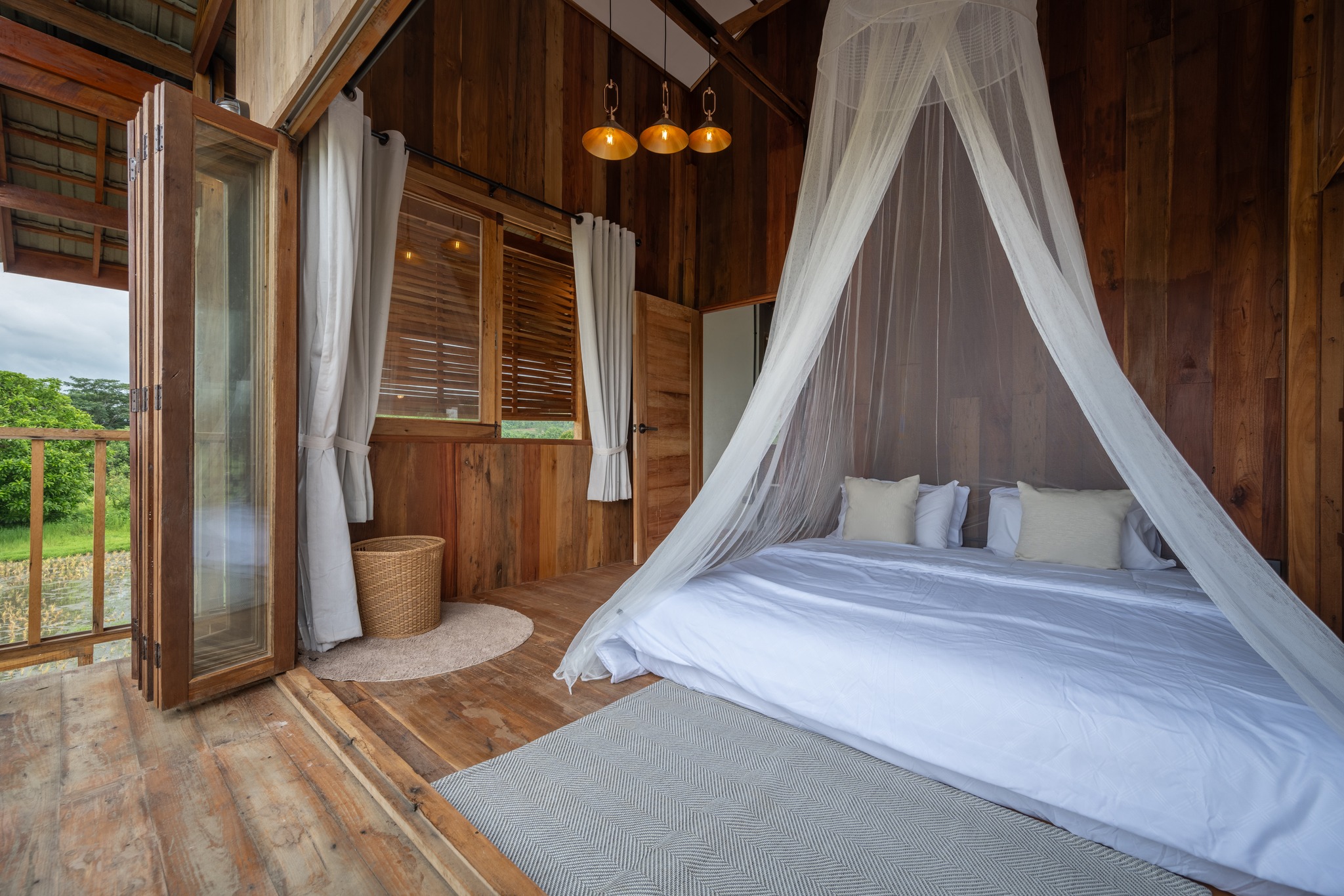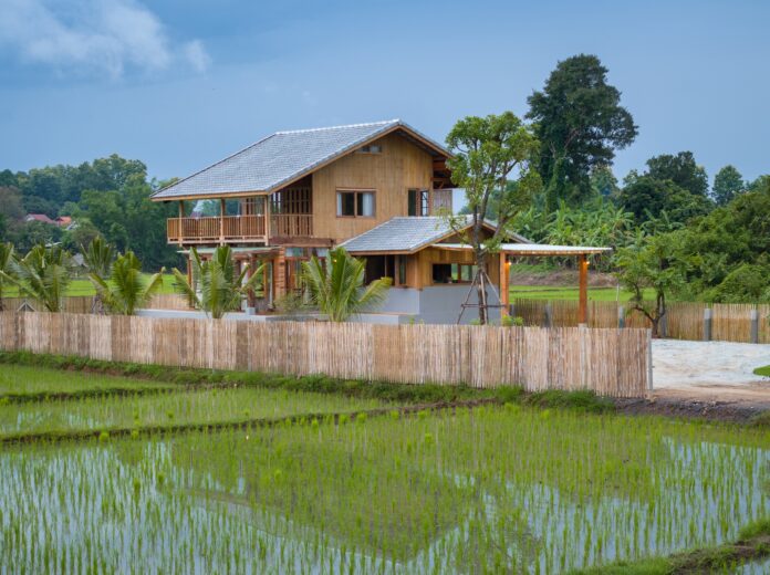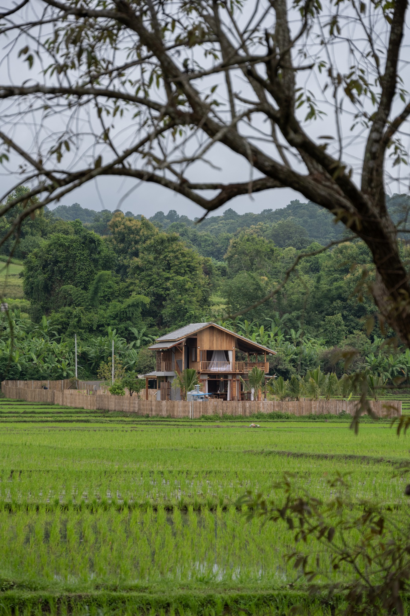 บ้านสวนหลังนี้อยู่ที่อำเภอแม่แตง จังหวัดเชียงใหม่ค่ะ เป็นผลงานออกแบบของ ช่างเฮ็ดแบบ ล้อมด้วยทุ่งนา ลำธารธรรมชาติ และวิวภูเขา
