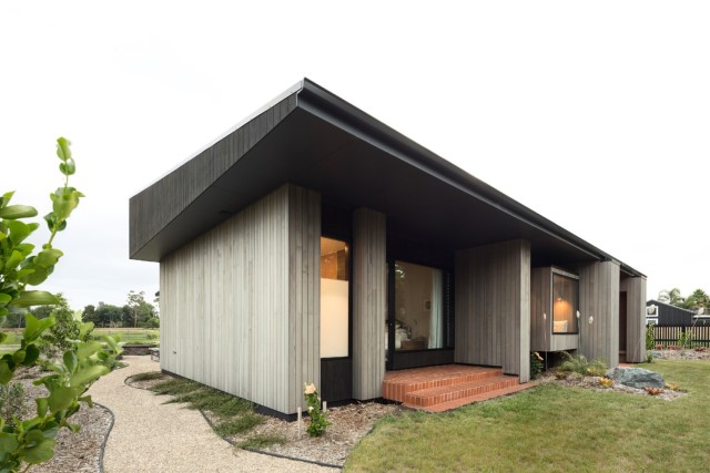 ตัวบ้านที่มีขนาดใหญ่ ออกแบบด้วยโครงสร้างคอนกรีต ดีไซน์ให้มีจังหวะ หดยื่น สร้างมุมมองที่แปลกตา ตกแต่งด้วยหลังคาทรงเพิงฯ ดูดีมีสไตล์เป็นที่สุด ผนังบ้านคอนกรีตสีเทาเข้ม ให้ความรู้สึกแบบมาดขึม และสลับการตกแต่งด้วยผนังไม้ ในบางจุด ดูอบอุ่น และผสมผสานกลิ่นอายแบบย้อนยุคนิดๆ อีกด้วย