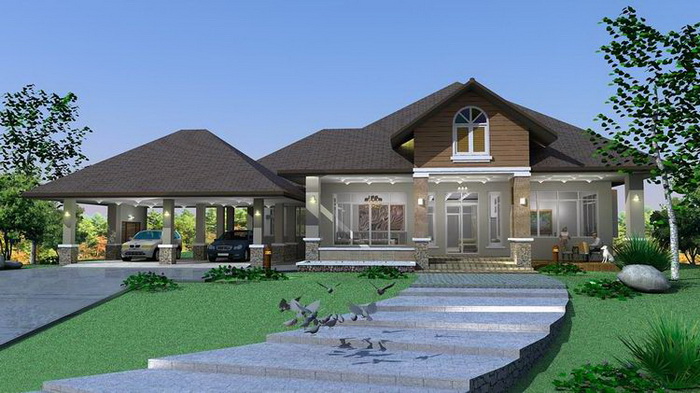 บ้านขนาดใหญ่ยกพื้นไม่สูงมากนัก ผนังภายนอกก่ออิฐฉาบปูนแต่งแต้มด้วยสีเทาอ่อน ตัวเสากรุแกรนิตลวดลายธรรมชาติ หลังคามุขทรงจั่วแบบต่างระดับ ขับให้บ้านดูโดดเด่นมากขึ้น ดานข้างปูลานปูนเชื่อมเข้าไปยังลานจอดรถขนาด 10 x 8 เมตร ส่วนด้านหน้าปลูกสนามหญ้าสีเขียวสดดูร่มรื่น อีกทั้งยังสามารถใช้เป็นลานทำกิจกรรมนอกบ้านได้ด้วยเช่นกัน