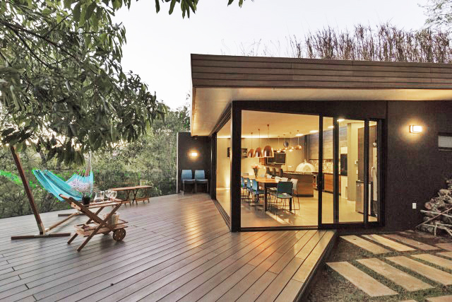 บ้านโครงสร้างคอนกรีต ตกแต่งแบบสมัยใหม่ ให้อารมณ์ดิบๆ อาร์ตๆ หลังคาทรงเพิงหมาแหงนลาดเอียงเก๋ๆ รับด้วยโครงเหล็ก และมุงด้วยเมทัลชีท น้ำหนักจึงเบา และดูโปร่งโล่งมากขึ้น