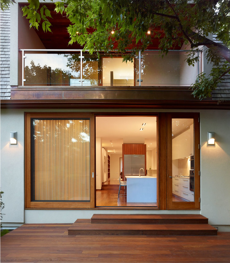 ประตูบ้านเป็นประตูไม้สีเข้ม พร้อมกับผนังกระจกใส ที่มองเห็นพื้นที่ภายในตัวบ้าน ด้านนอกจะมีเฉลียงเล็ก ๆ ที่สามารถประดับ หรือตกแต่งด้วยต้นไม้เล็ก ๆ เพื่อเพิ่มเสน่ห์ให้บ้านได้