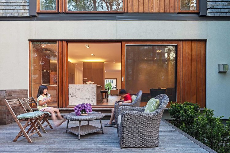 บริเวณพื้นที่หลังบ้าน จะเป็นพื้นที่เพื่อการพักผ่อนโดยเฉพาะ เพราะเมื่อออกจากตัวบ้านมา เราก็จะพบกับเฉลียงไม้ที่เชื่อต่อกับบริเวณของสวนหลังบ้าน