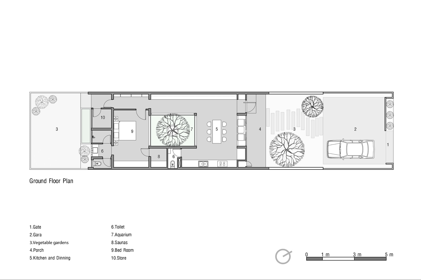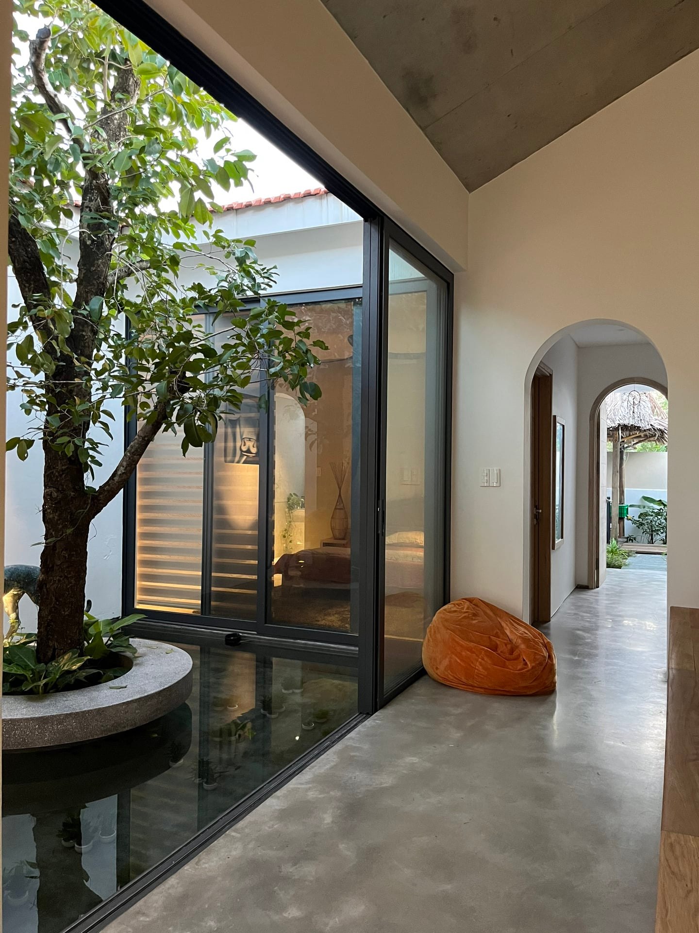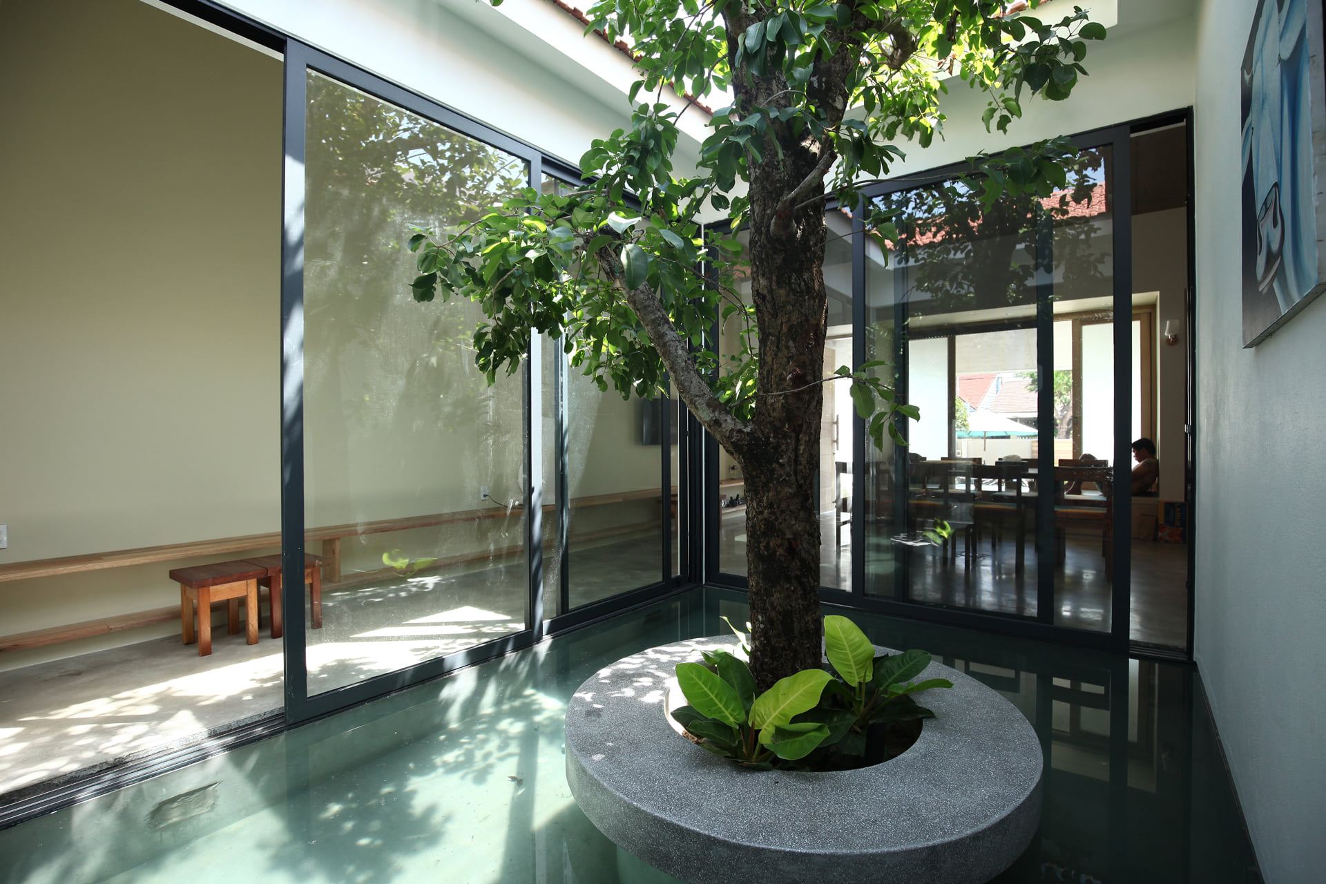 ที่ตรงกึ่งกลางของบ้าน สถาปนิกได้ออกแบบบ่อน้ำเล็ก ๆ ที่ตรงกลางมีต้นไม้ปลูกเอาไว้ พร้อมกับมีหลังคาที่เปิดโล่ง ซึ่งนอกจากจะให้ความเย็นงามแล้ว ยังช่วยให้บ้านเย็นสบายในหน้าร้อนอีกด้วย