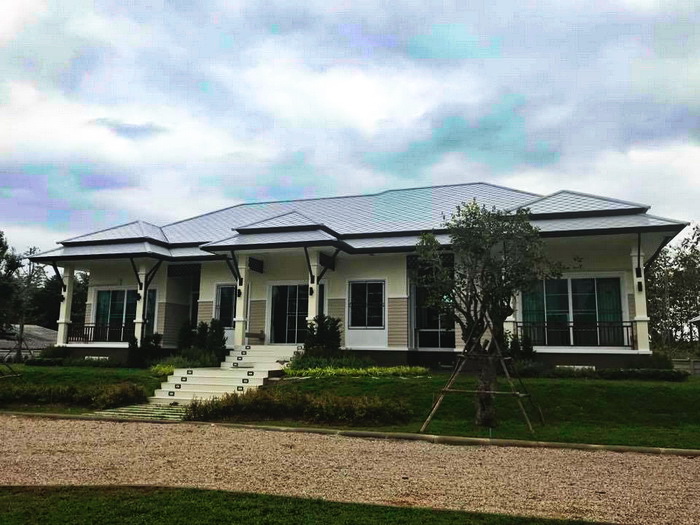 ตัวบ้านสีครีมอ่อน กรุแต่งด้วยผนังไม้เทียมสีอ่อน ปกคลุมด้วยหลังคาทรงไทยประยุกต์โทนสีเทา ก่อเกิดเป็นบ้านรูปลักษณ์ทรงร่วมสมัยที่ให้ทั้งความสวยงามและดีไซน์ที่ดูเป็นเอกลักษณ์