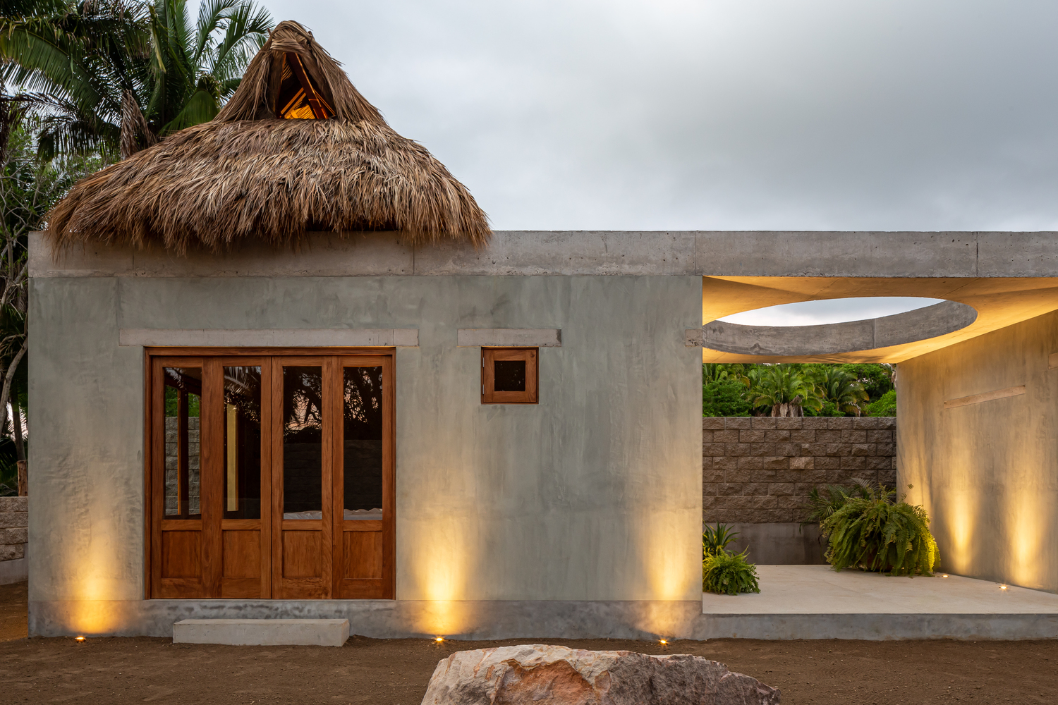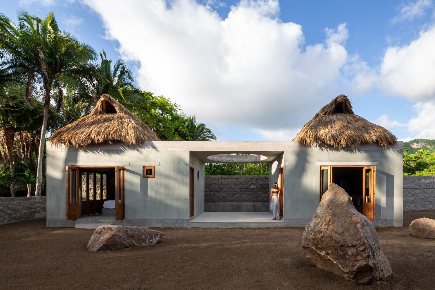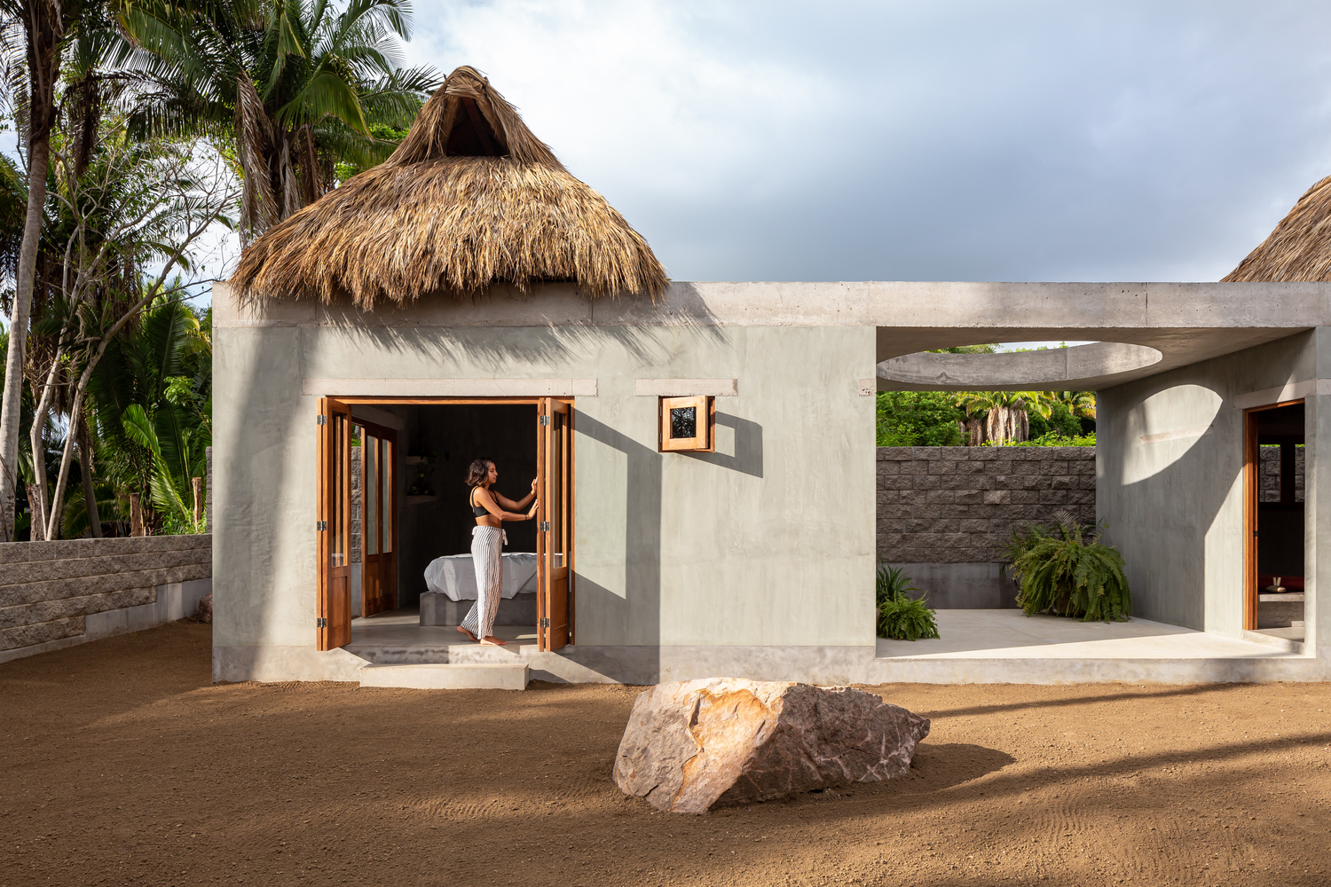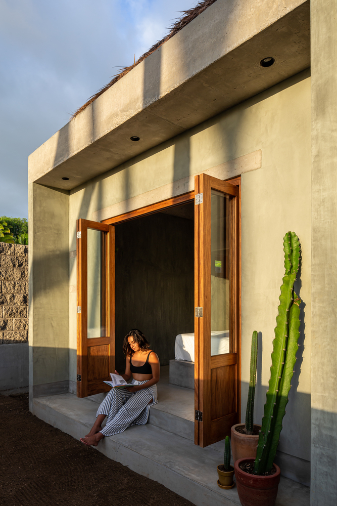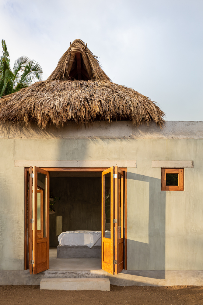 การออกแบบโดยทั่วไปนั้น ตัวอาคารจะมีรูปทรงเรขาคณิต มีโครงสร้างเป็นปูนเปลือยทั้งหลัง จึงให้ความสวยดิบ ในขณะที่ส่วนของหลังคาจะมีโครงสร้างเป็นไม้ มุงด้วยใบไม้จากธรรมชาติ เพื่อให้บ้านหลังนี้มีความเป็นบ้านพักตากอากาศนั่นเอง