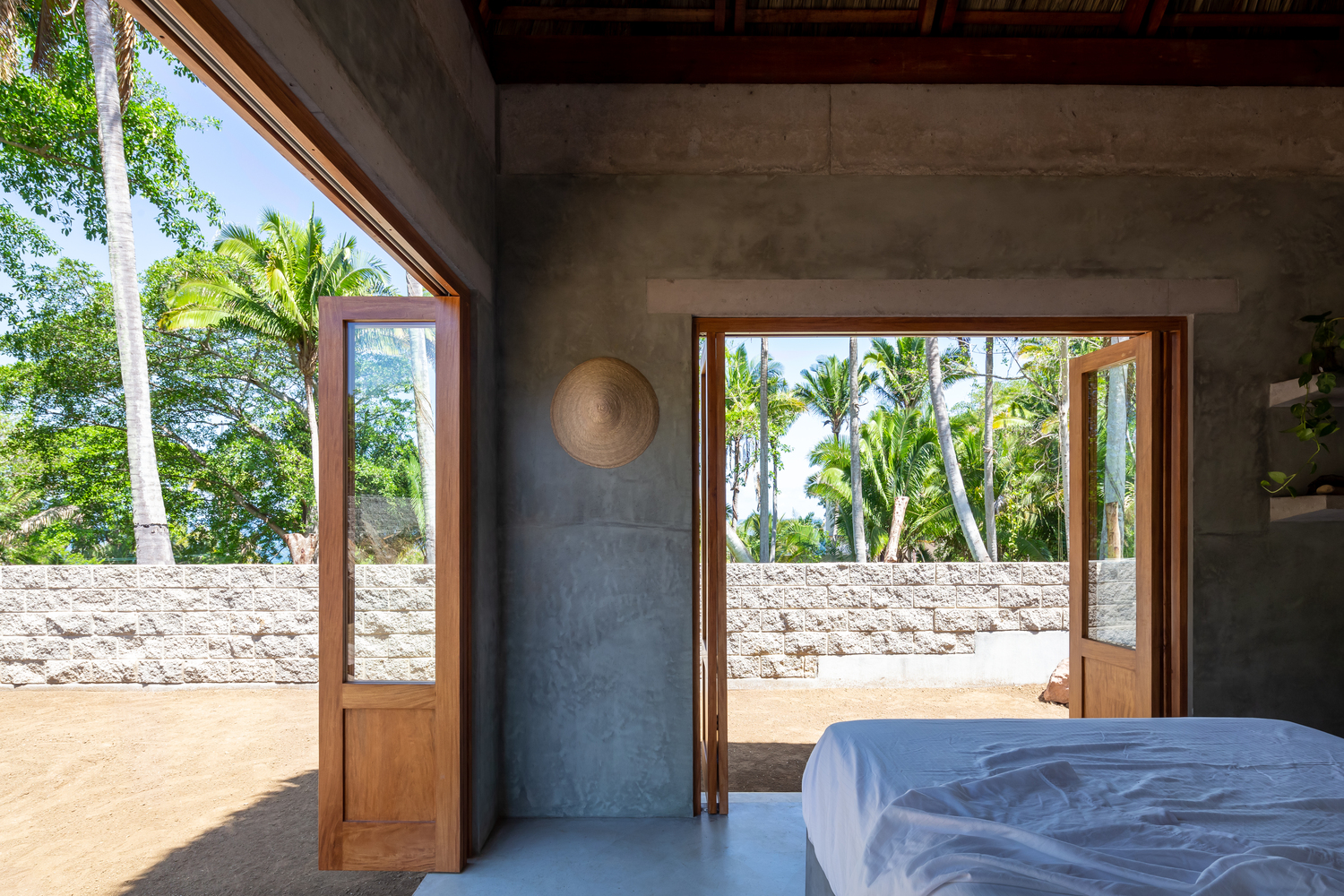กลับมาที่ตัวบ้านอีกครั้ง ในแต่ละห้อง สถาปนิกได้ออกแบบประตูเป็นแบบบานพับ จึงสามารถเปิดได้กว้าง เพื่อให้เหมาะกับบรรยากาศชายทะเลนั่นเอง