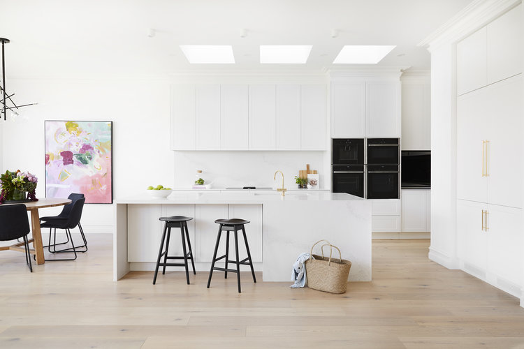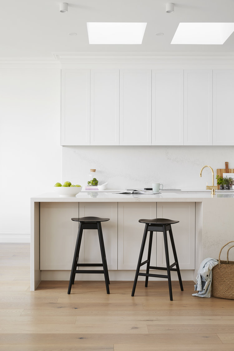 ที่ติดกันกับห้องนั่งเล่น จะเป็นครัวเย็น หรือครัวแบบตะวันตก ที่เหมาะกับการทำเมนูอาหารที่กลิ่นละควันไม่มาก ซึ่งก็มาในโทนสีขาวสว่าง
