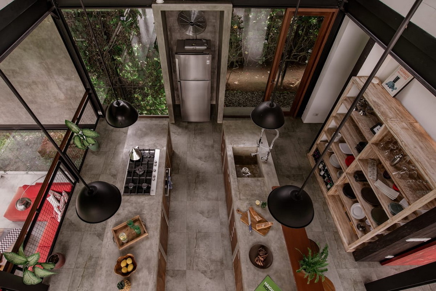 ห้องครัวเป็นอีกพื้นที่หนึ่งที่ออกแบบได้อย่างโดดเด่นด้วยเคาน์เตอร์ครัวแบบปูนเปลือย โดยมีลักษณะเป็นเคาน์เตอร์ครัวแบบเกาะกลาง