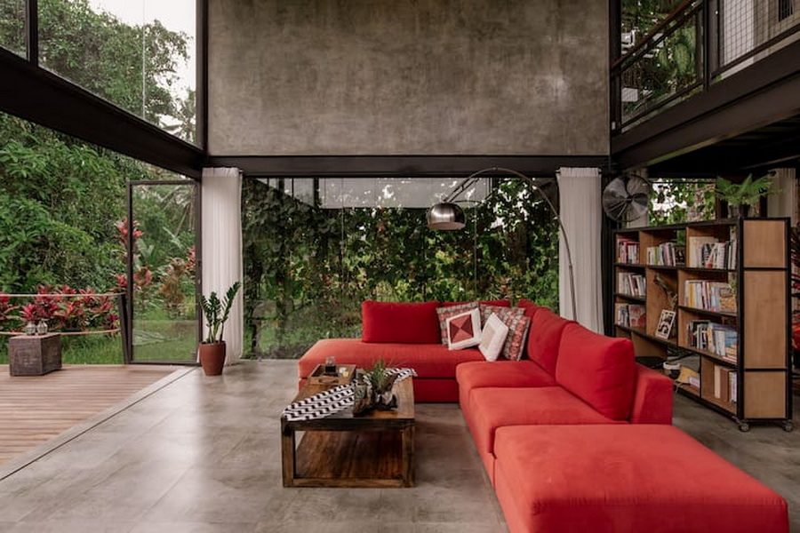 ห้องโถงหลังของบ้านเป็นห้องนั่งเล่นขนาดใหญ่ มีชุดโซฟาสีแดงโดดเด่นเด่นกลางห้อง ด้านหลังถูกตกแต่งด้วยผนังอิฐโชว์แนวกับเฟอร์นิเจอร์งานโลหะ